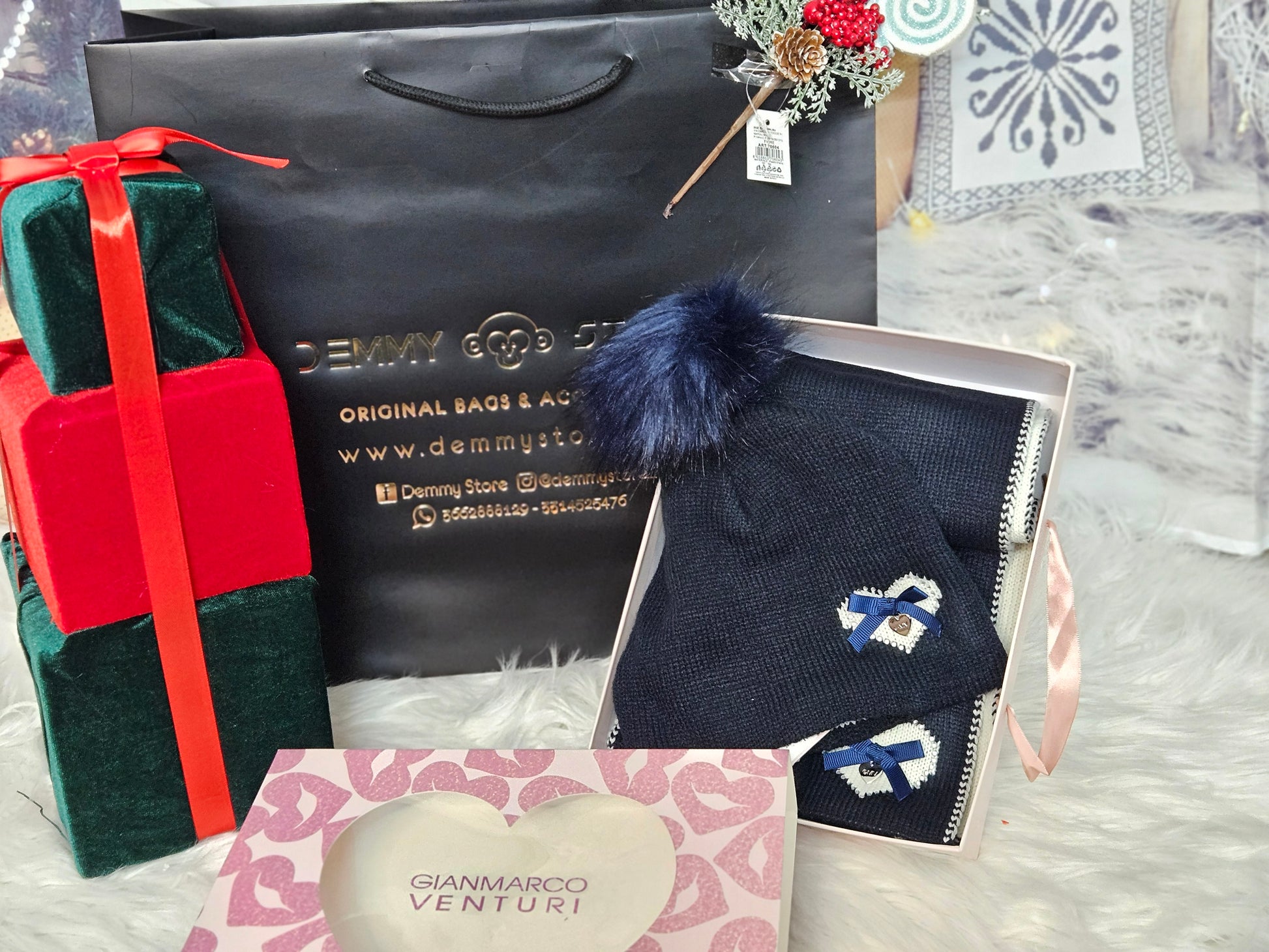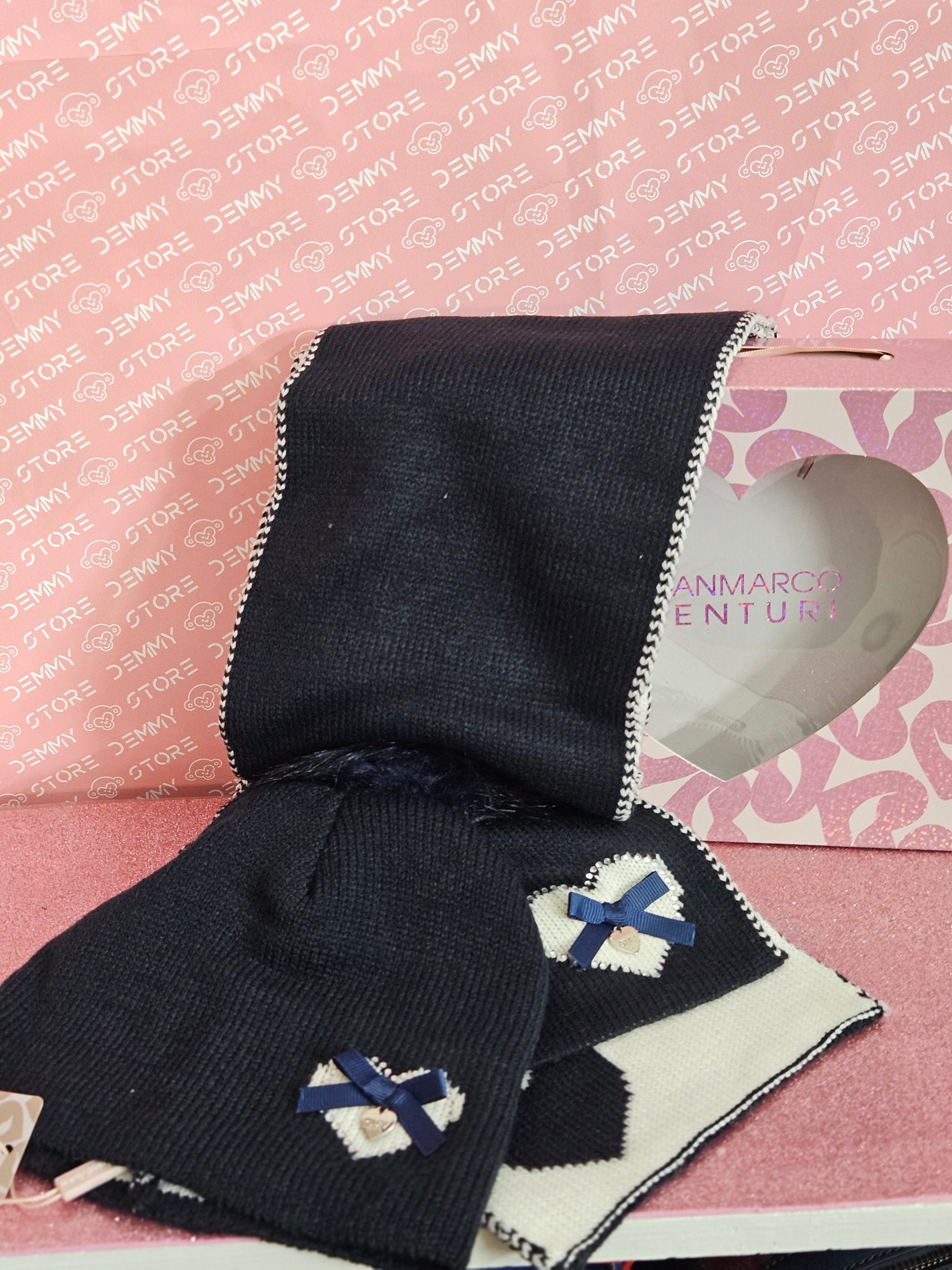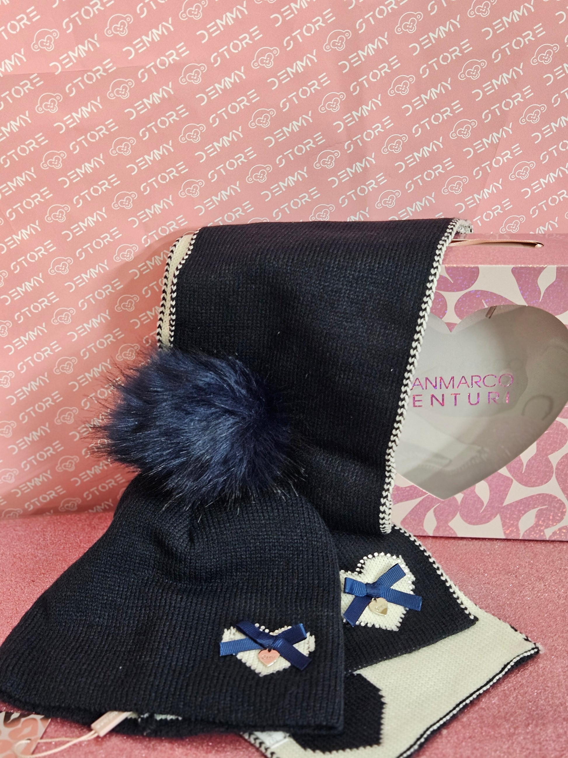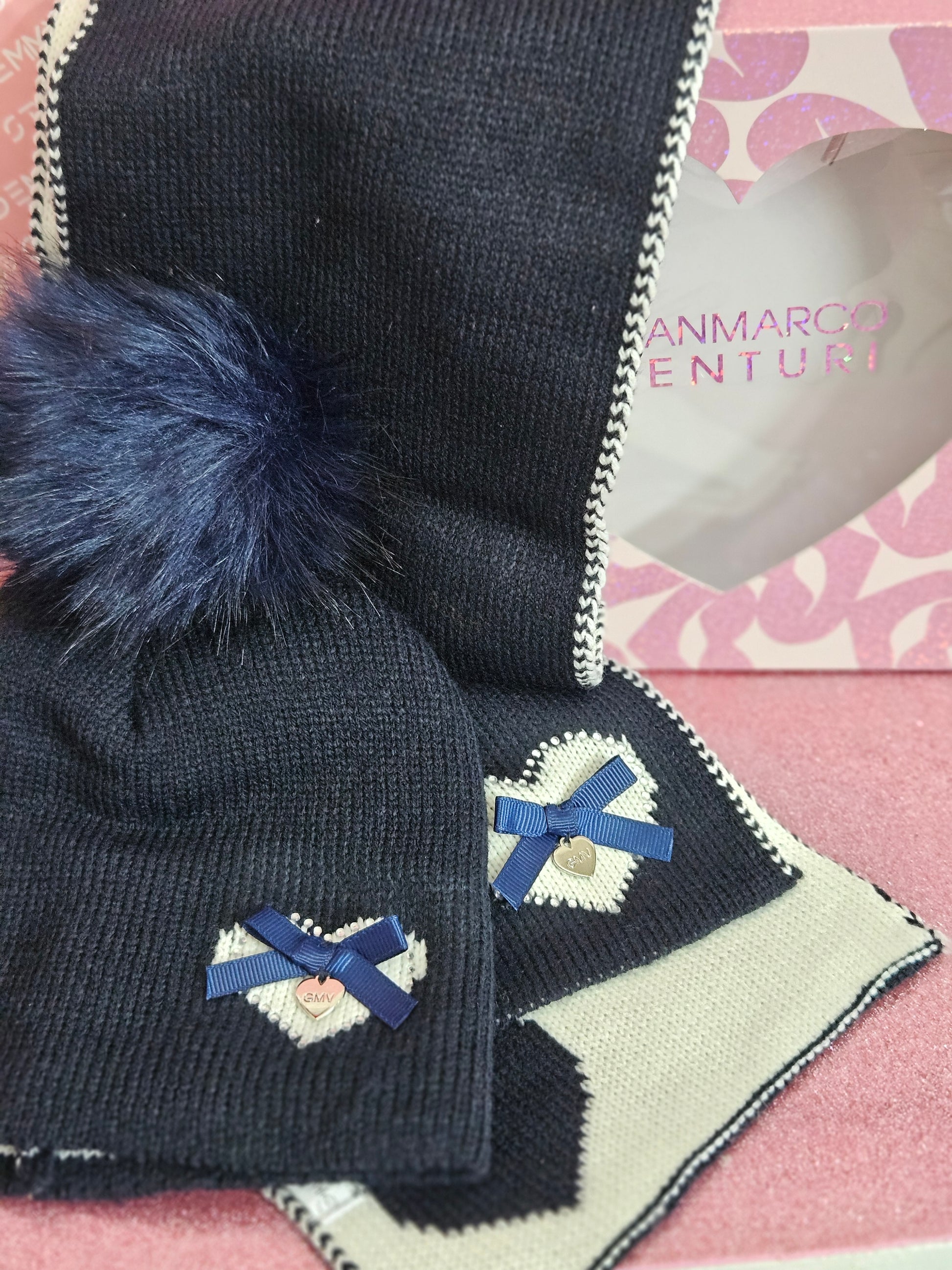 Comprende sciarpa + cappello pom pon, in scatola regalo.