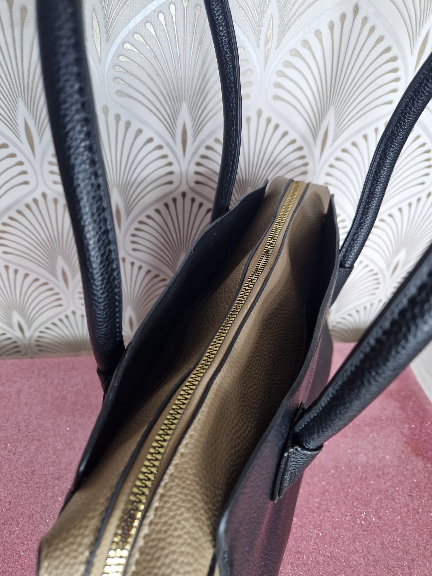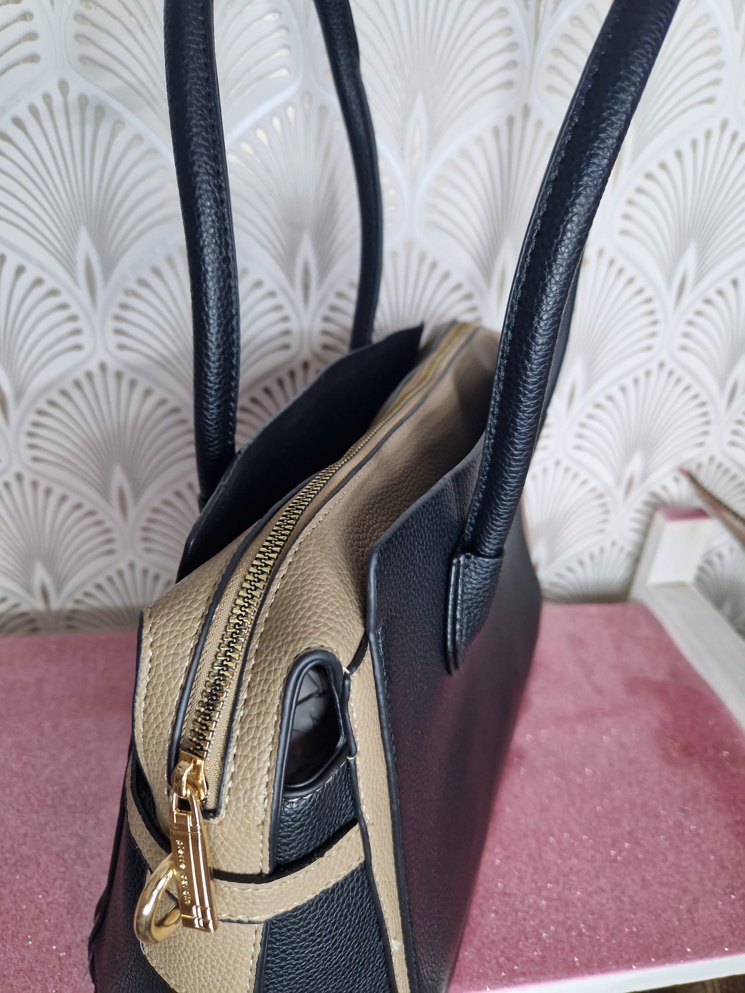 Raffinata borsa dal design classico e femminile, chiusura superiore a zip con doppio manico.