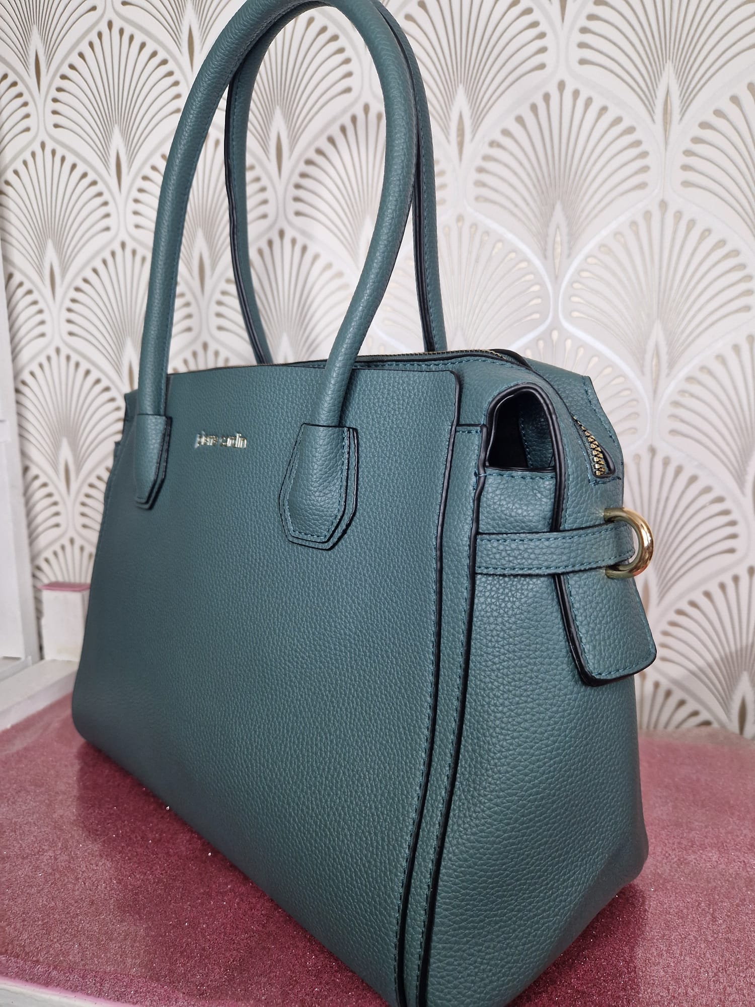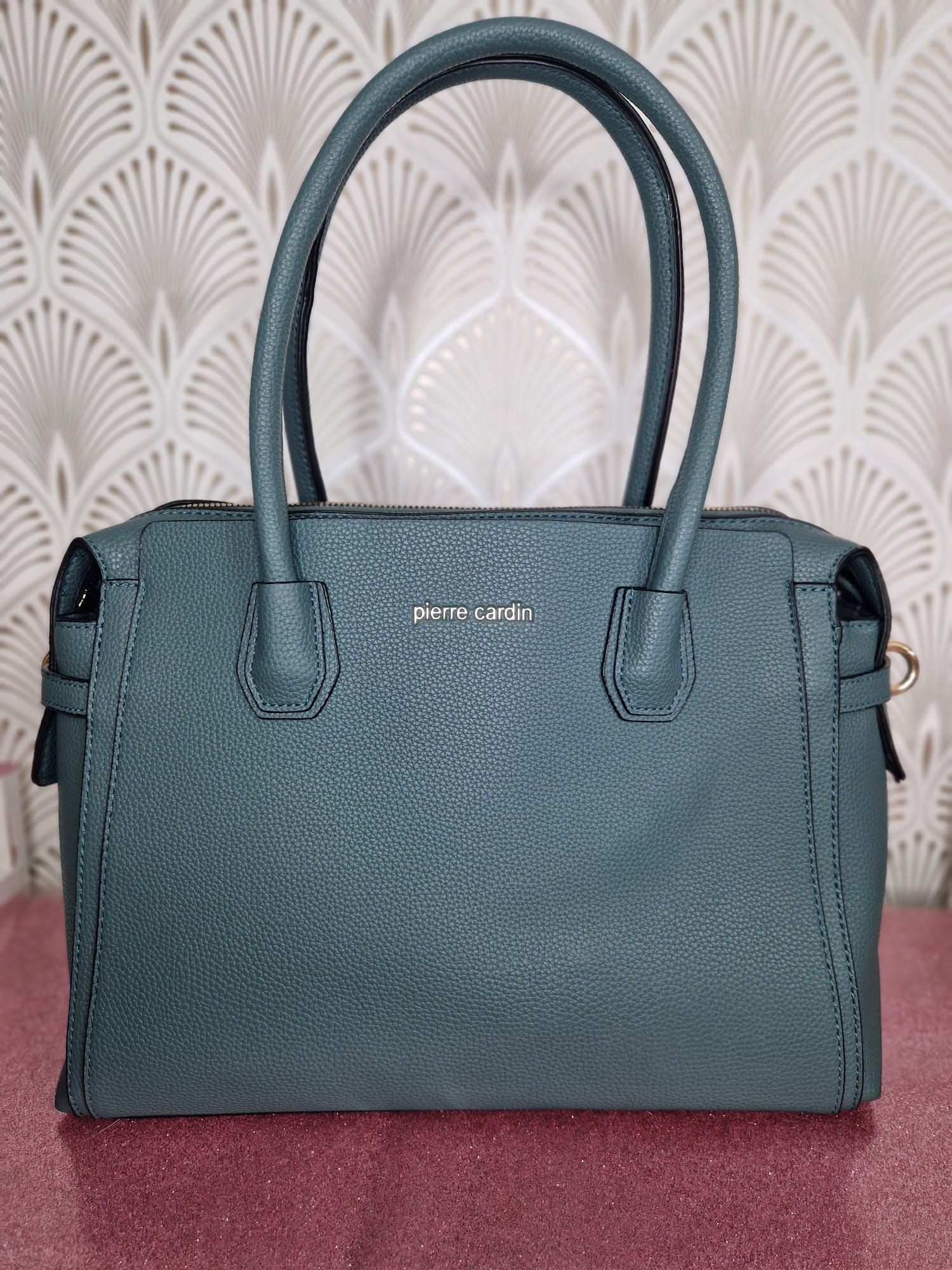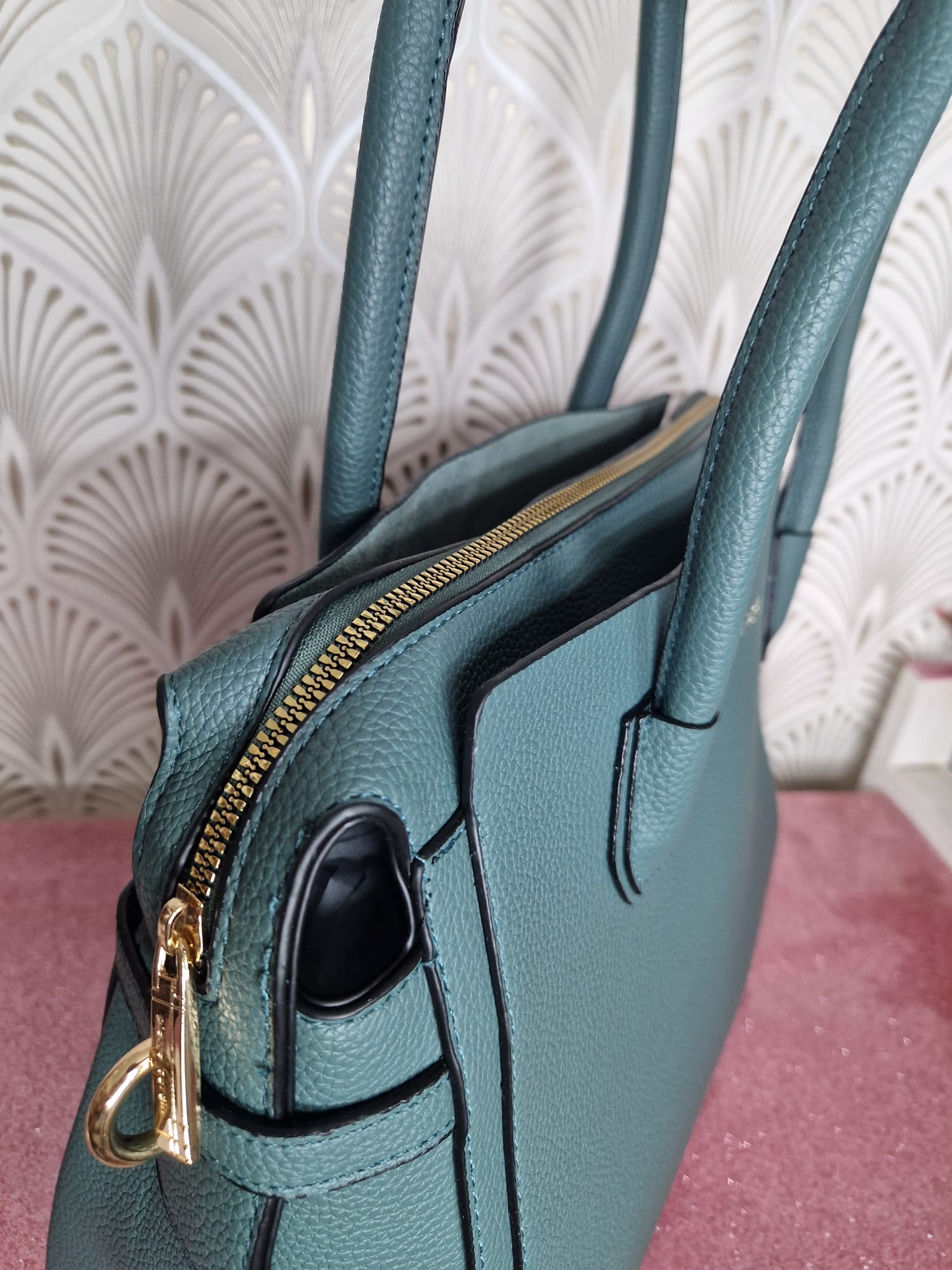 Raffinata borsa dal design classico e femminile, chiusura superiore a zip con doppio manico.