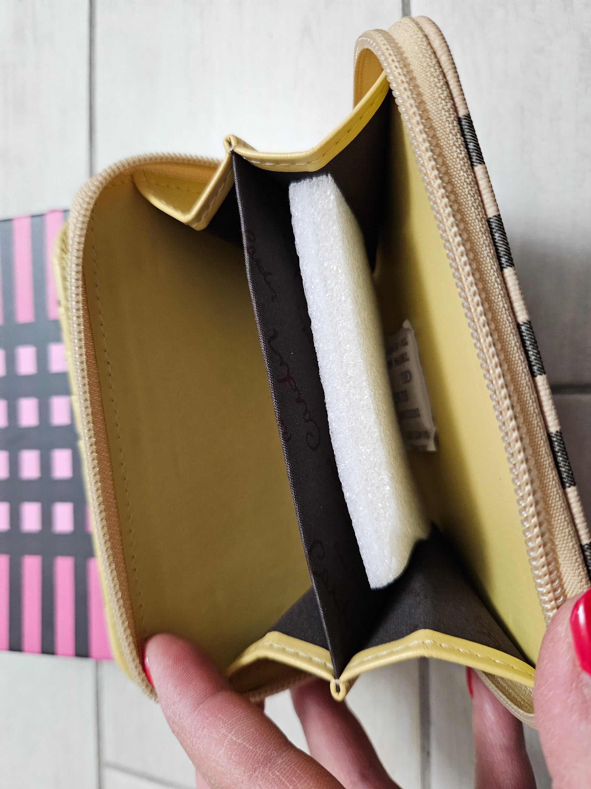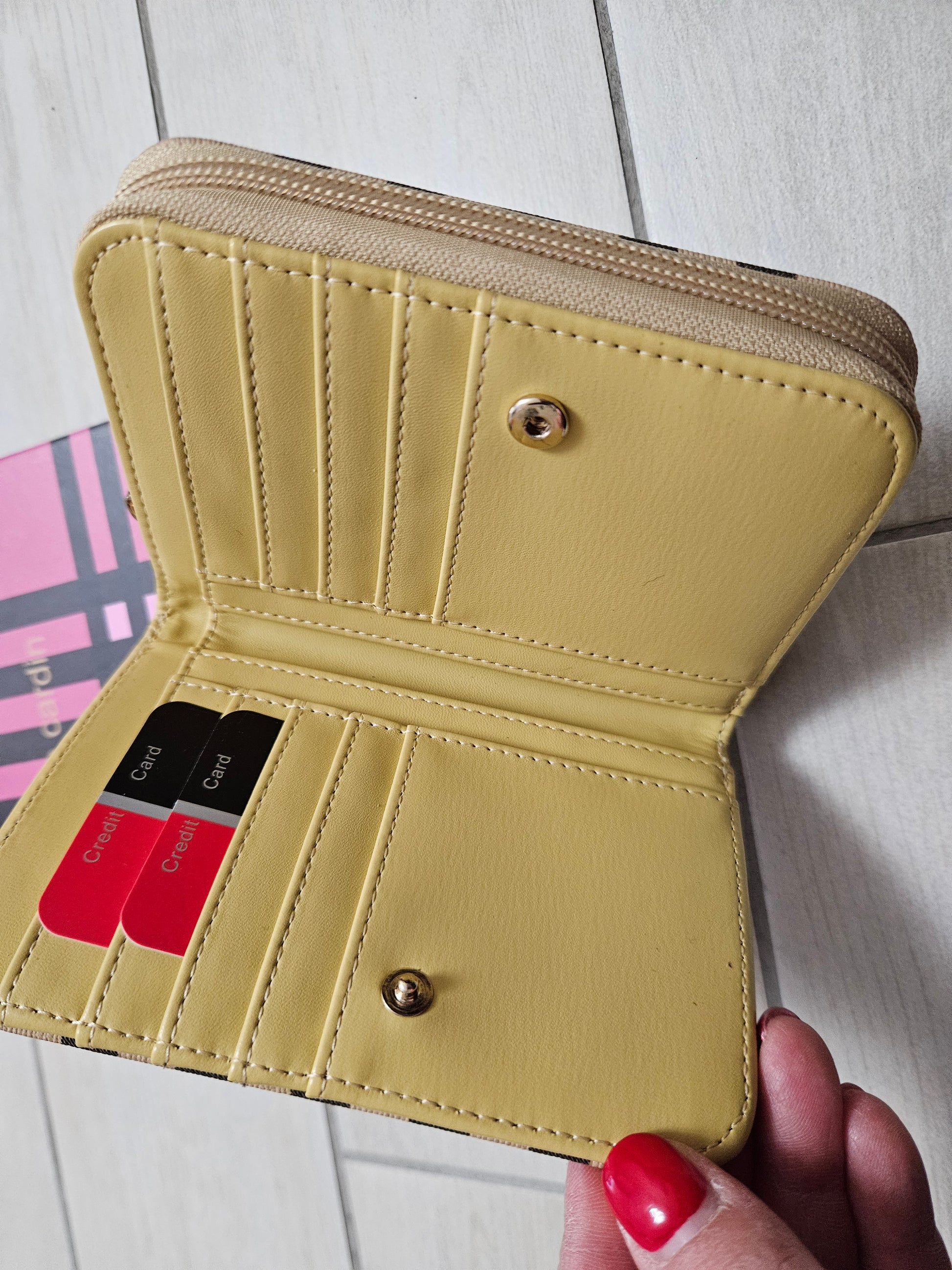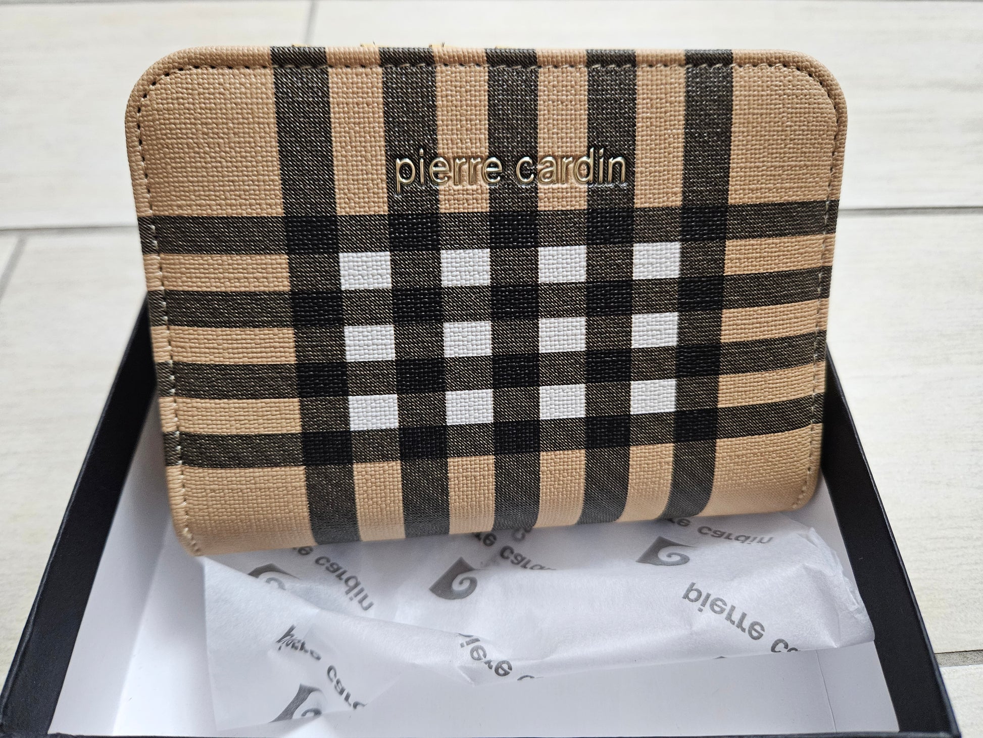 Borsellino donna Pierre Cardin, chiusura a zip e patta con scompartimenti interni per carte, monete e banconote in ecopelle.