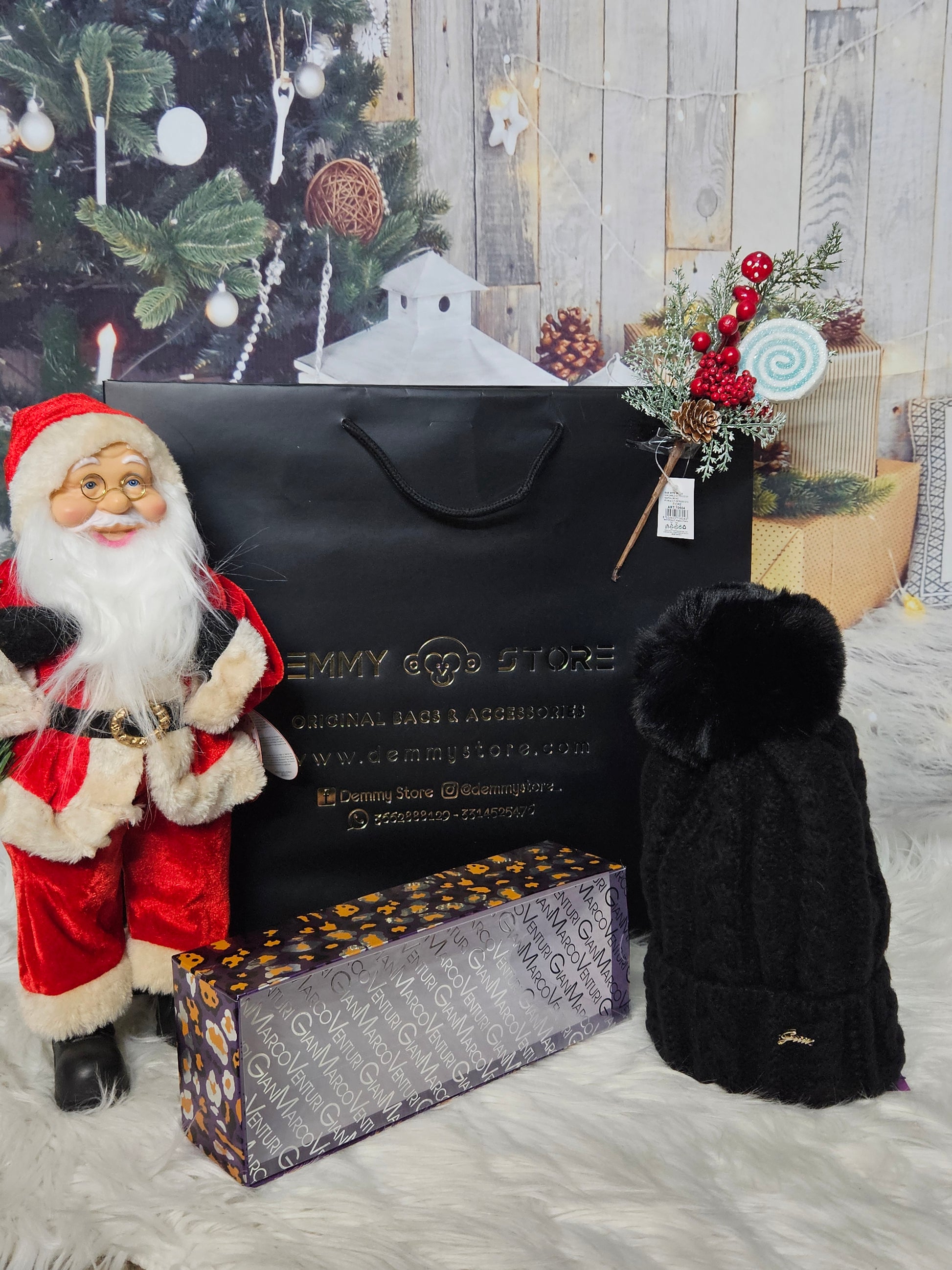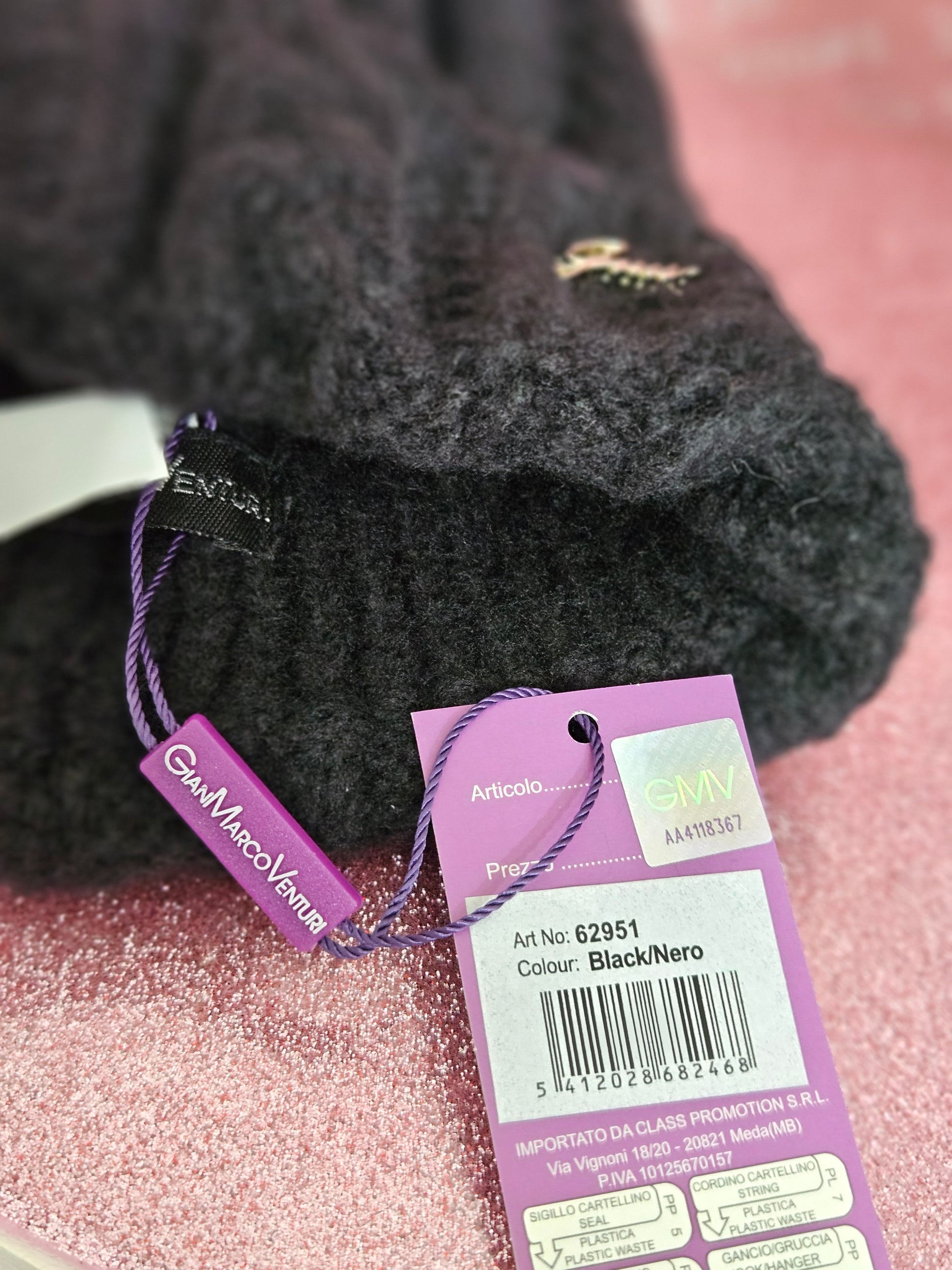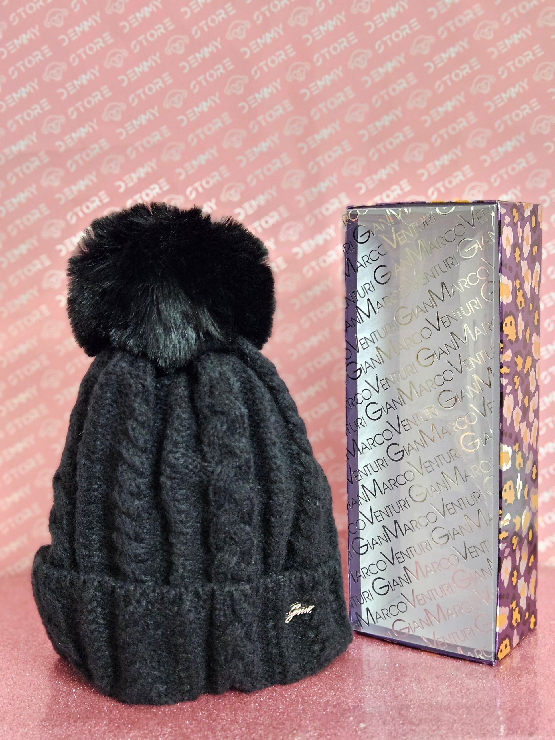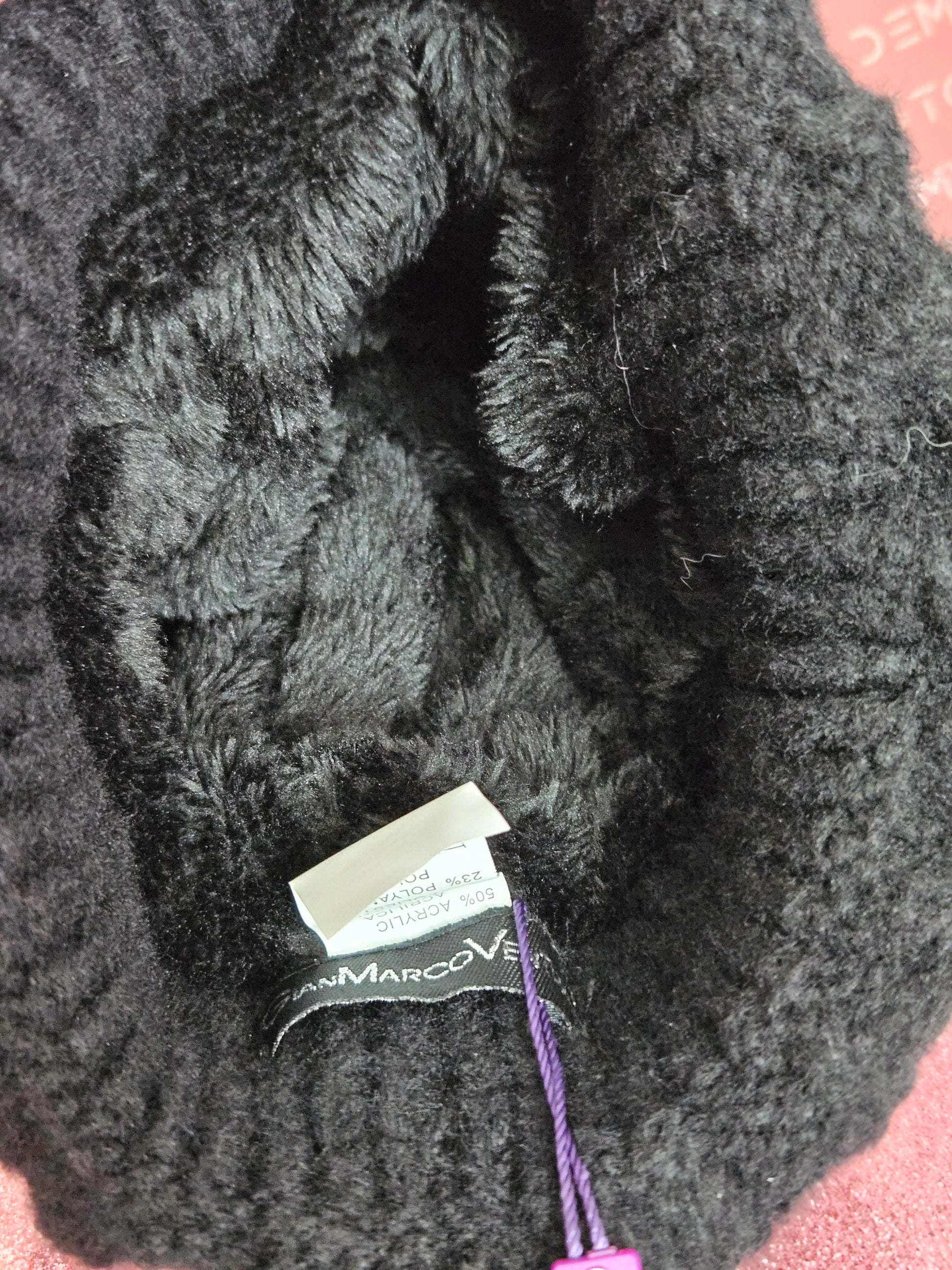 Cappello donna in maglia elasticizzata, con trama incrocio treccia, pom pon in ecopelliccia. Interno con pelliccia.