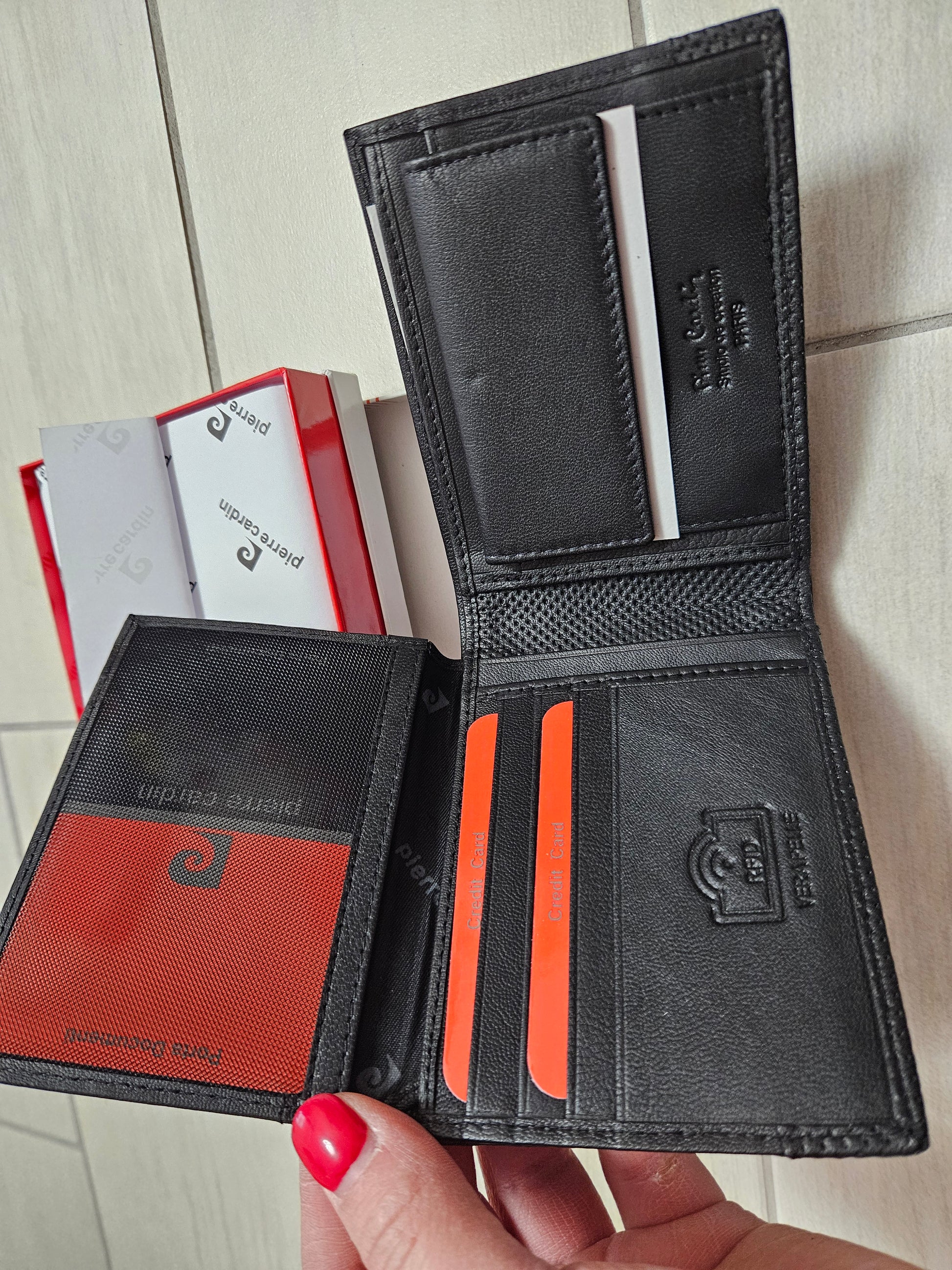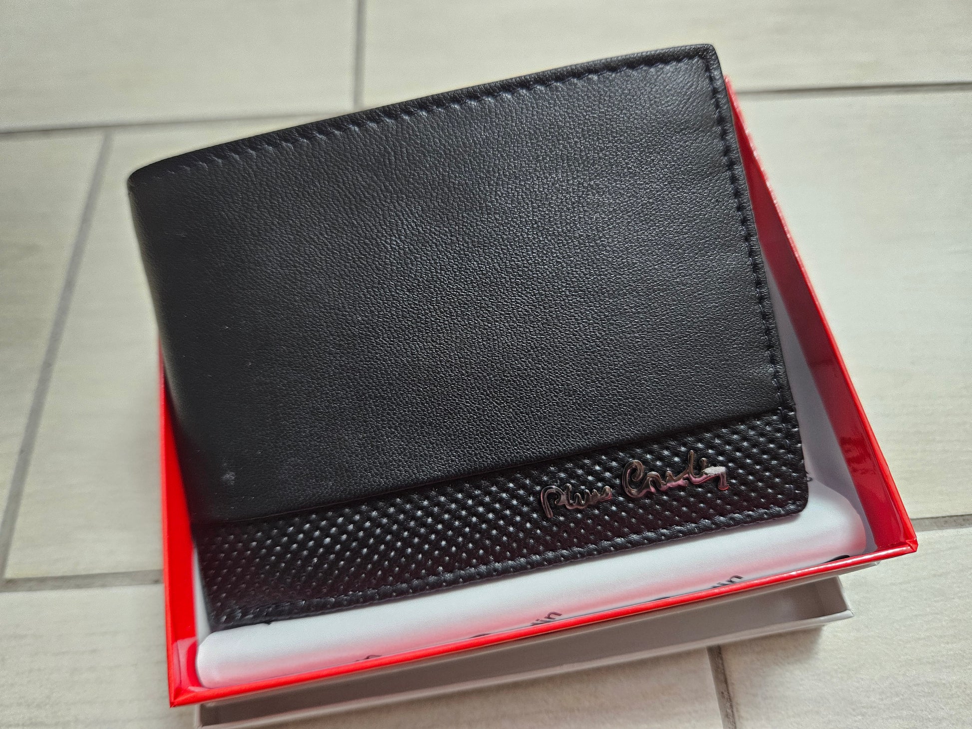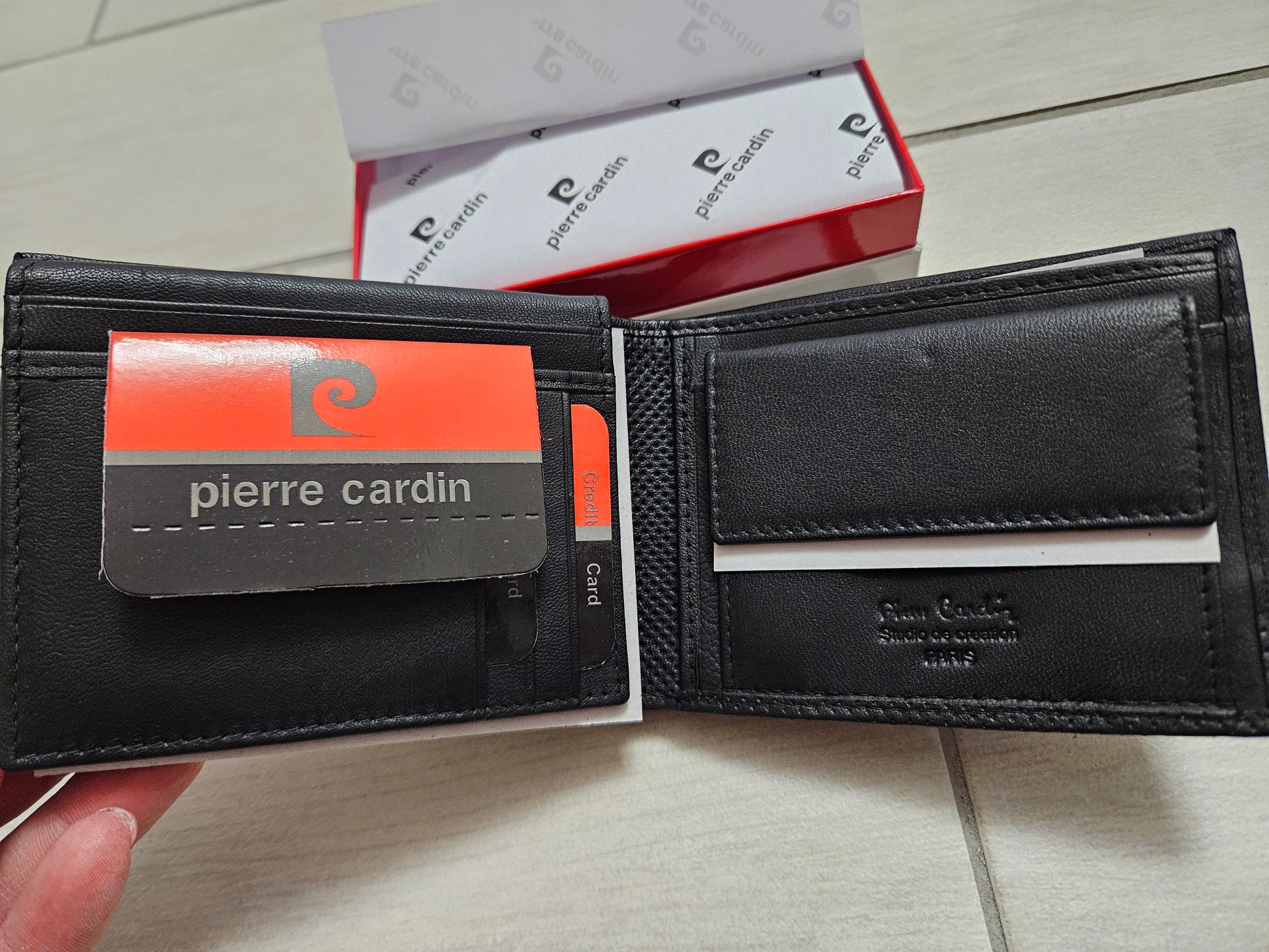Portafoglio da uomo Pierre Cardin nero, perfetto per l'uso quotidiano. Realizzato in vera pelle, offre organizzazione e stile. L'interno presenta scomparti per carte, un porta monete con chiusura a bottone e una tasca a rete per documenti o foto.